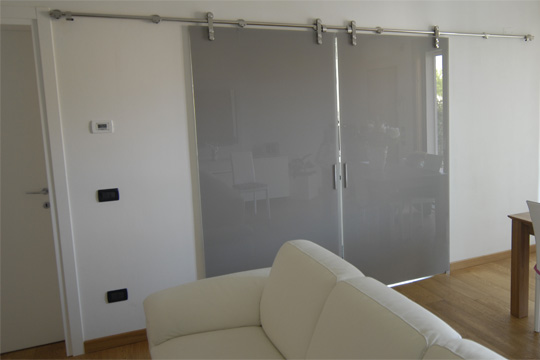 Gray Bypass Partition Doors are excellent way to decorate your workplace. Please call us to discuss your custom design needs.